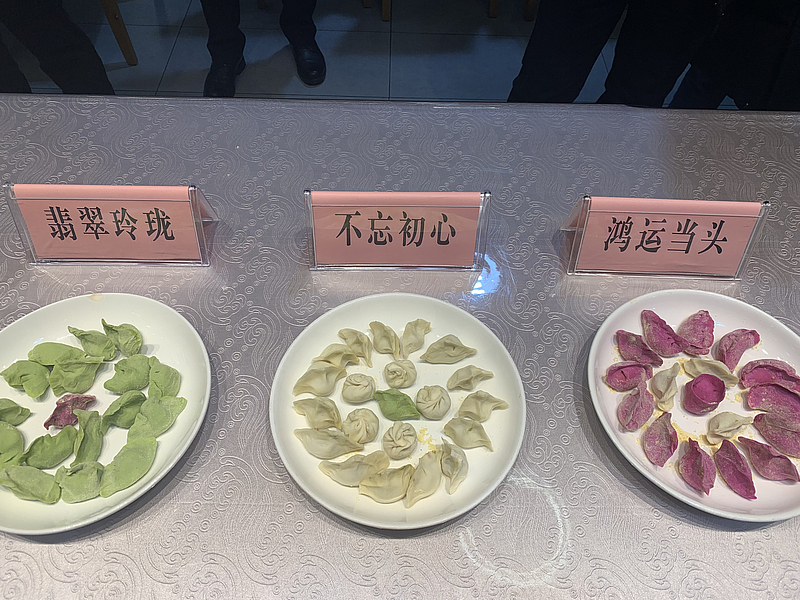 活動首先通過暖場小游戲?qū)⑴c人員分為三組,根據(jù)菠菜、火龍果等不同顏色、不同口味的面團(tuán),設(shè)置“鴻運當(dāng)頭”“不忘初心”“翡翠玲瓏”的組名,餐廳工作人員為大家演示包餃子的正確手法。
