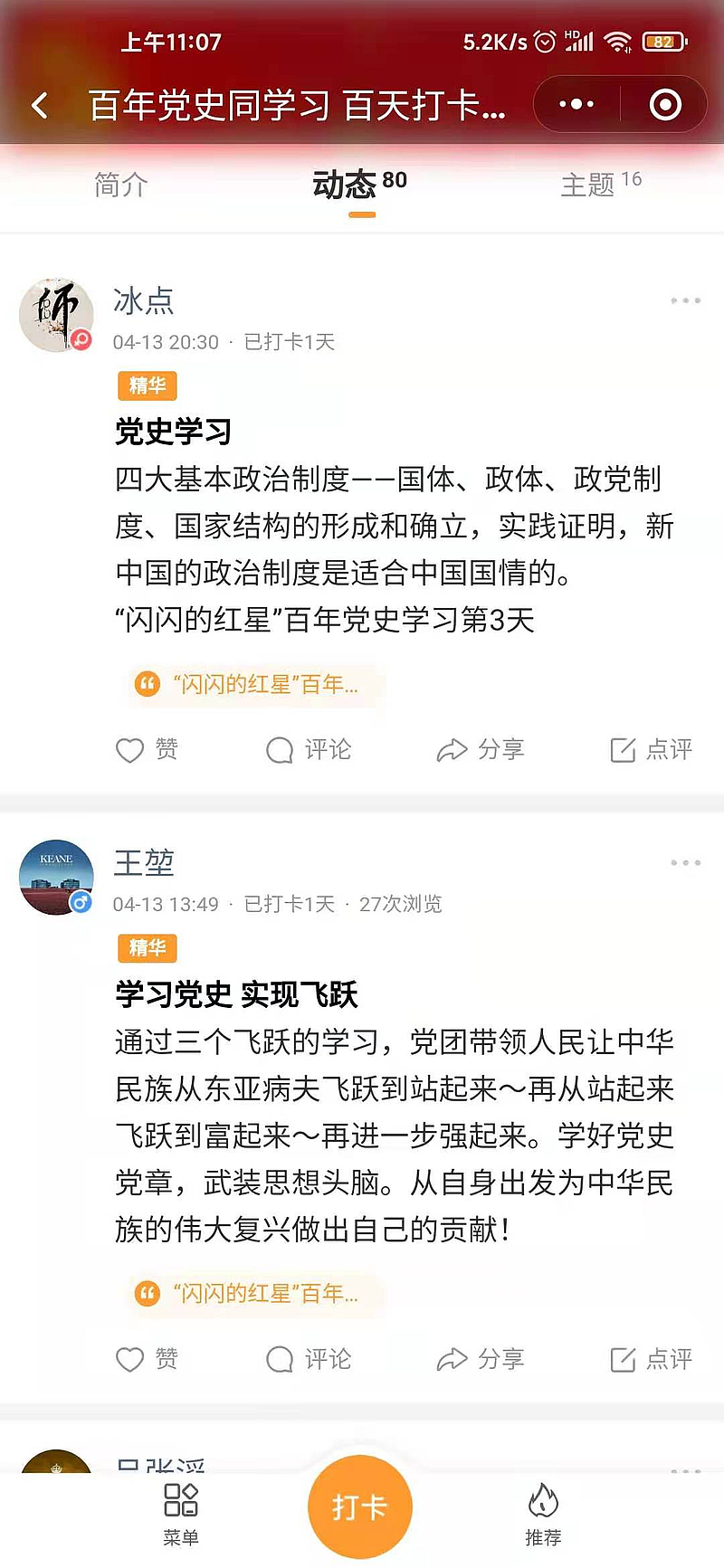 為慶祝中國(guó)共產(chǎn)黨成立100周年,創(chuàng)新黨史學(xué)習(xí)教育形式,營(yíng)造濃厚黨史學(xué)習(xí)教育氛圍,近日,灃西集團(tuán)投資公司黨支部閃閃的紅星“百年黨史同學(xué)習(xí) 百天打卡共進(jìn)步”活動(dòng)正式啟動(dòng)。活動(dòng)圍繞“344”模式,即結(jié)合“黨史學(xué)習(xí)、學(xué)習(xí)心得分享、積分打卡PK”3大板塊,通過(guò)“讀、聽(tīng)、學(xué)、悟”4種學(xué)習(xí)方式,滿(mǎn)足黨員“隨時(shí)學(xué)、隨地學(xué)、自主學(xué)、互動(dòng)學(xué)”4種學(xué)習(xí)需求,實(shí)現(xiàn)黨建經(jīng)營(yíng)雙促進(jìn)的總目標(biāo)。