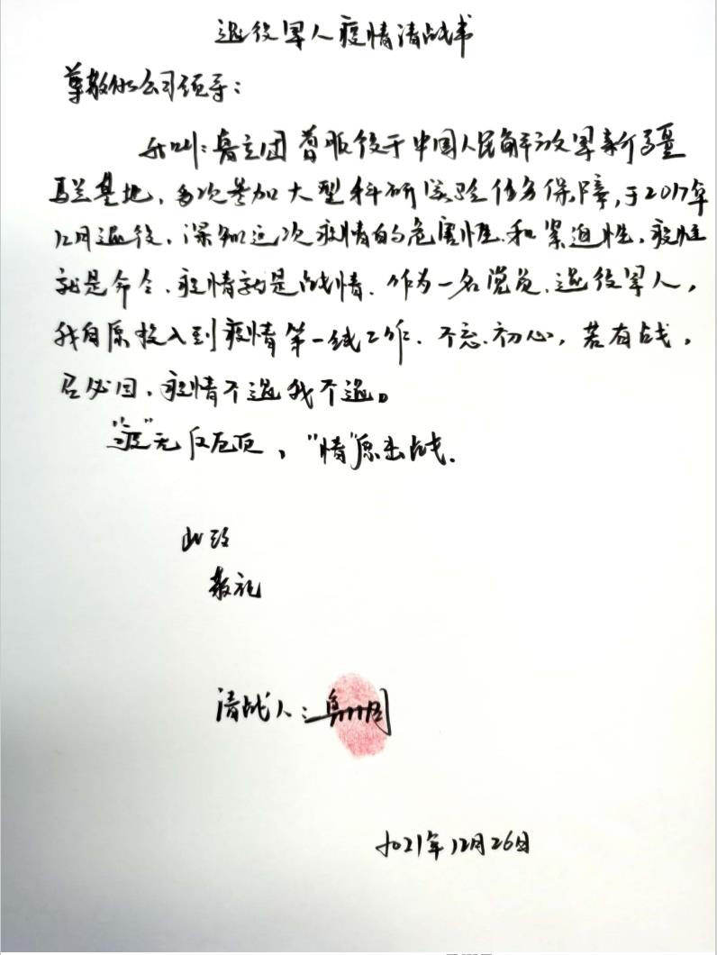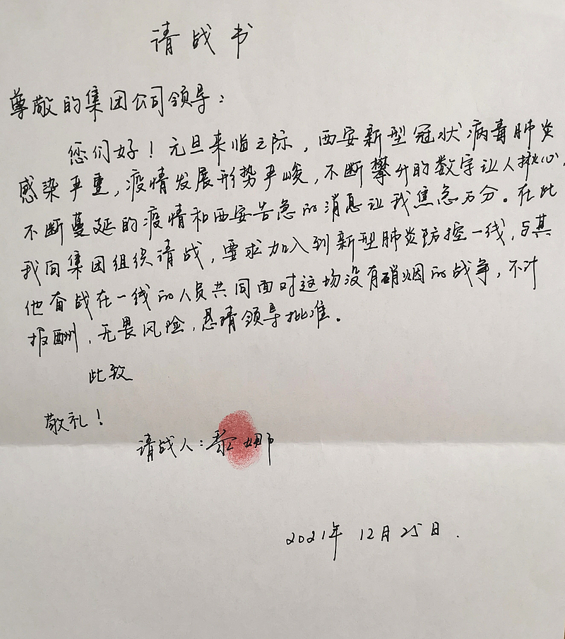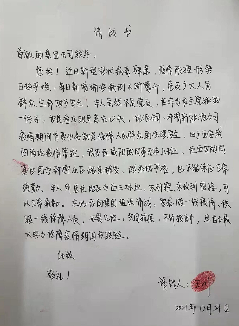 “本人居住小區(qū)未被封控,可以保證正常通勤,我向組織請戰(zhàn),要求做一線防疫、供暖保障人員,無畏風險、不計報酬!”這是一名80后員工,她叫王川,是灃西集團下屬子公司能源公司的一名員工,在防疫工作開始后,她一貫沖在前干在前,值班時總是要求第一班。為了讓其他同事可以休息,可以輪休的情況下依然堅持每天到公司到崗上班,保證工作不斷檔。公司在防疫執(zhí)勤點排班時主要安排男同志,但身為女同志,她多次申請前往一線。12月27日,在全市新一輪核酸檢測行動開始前,王川同志主動手寫請戰(zhàn)書,再次要求到一線防疫!目前在灃西新城馬王村開展防疫工作。