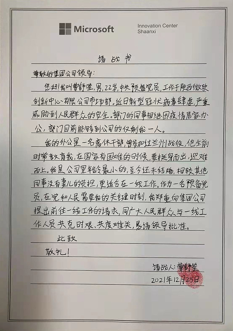 “我是土生土長的灃西人,對附近村子情況比較了解,我申請出戰(zhàn)抗疫一線!”“作為一名共青團員,深知此次防疫責任重大、人員緊缺,我堅決服從組織調配!”“來到公司剛好三個月,期間感受到了組織的溫暖,現(xiàn)在組織需要我,我申請出戰(zhàn)!”“我曾參與2020年疫情防控工作,對防疫工作比較熟悉,能夠更快進入工作狀態(tài),請組織批準出戰(zhàn)!”........