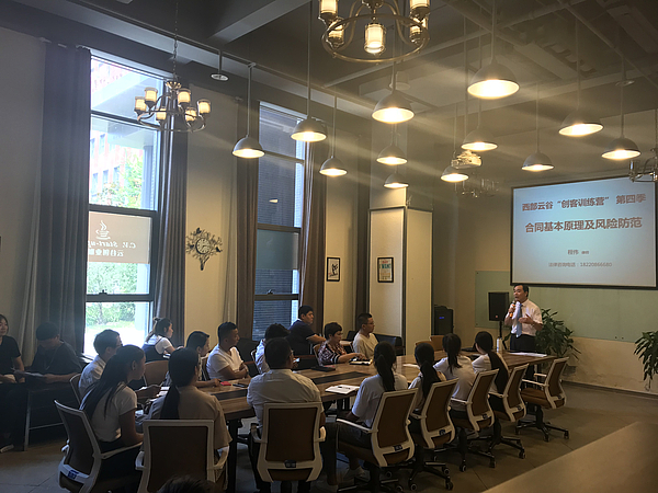 2018年8月9日,云谷創(chuàng)客訓(xùn)練營(yíng)第四季“合同風(fēng)險(xiǎn)防范”知識(shí)講座在西部云谷順利舉行。本期課程邀請(qǐng)陜西樂友律師事務(wù)所程偉律師為西部云谷園區(qū)企業(yè)進(jìn)行講解,吸引了30余名創(chuàng)業(yè)者參與。