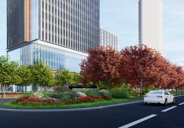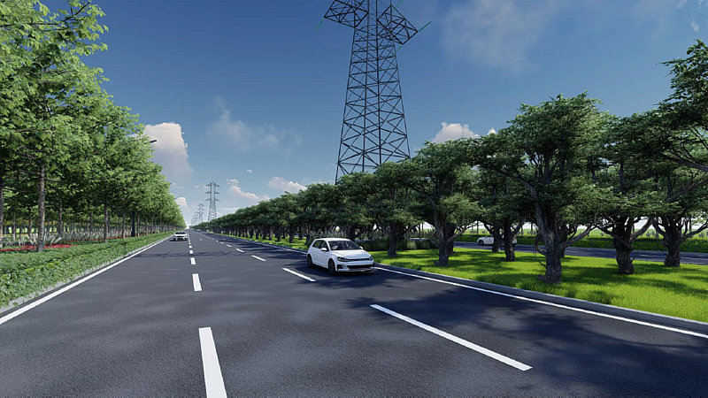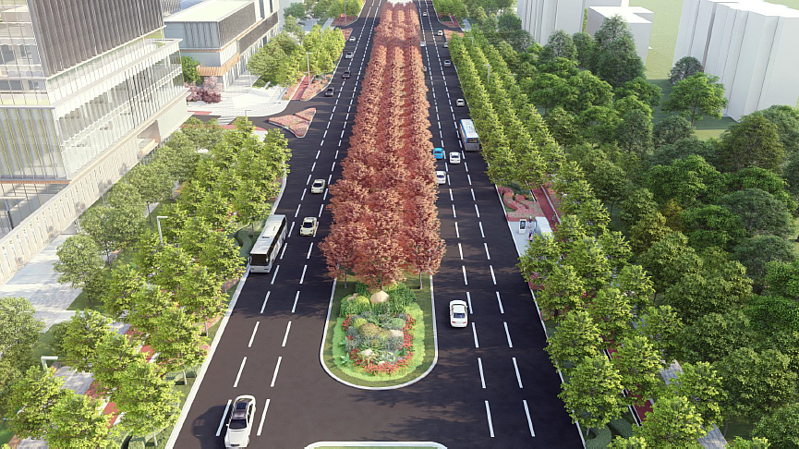 為城市主干路景觀配套,全長(zhǎng)1.6公里,綠化面積約9萬(wàn)平方米。該路段通過(guò)栽植高大喬木法桐、油松、國(guó)槐等鄉(xiāng)土樹(shù)種,端頭點(diǎn)綴組團(tuán)植物群,致力于構(gòu)建自然生態(tài)的植物景觀,營(yíng)造休閑舒適的品質(zhì)街景。計(jì)劃于2023年完成相關(guān)區(qū)域地形整理及綠化栽植施工。