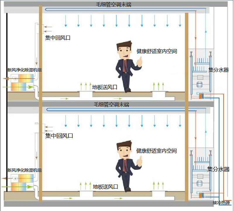 利用中深層地?zé)崮芄岬耐瑫r(shí),升級應(yīng)用清潔能源3.0模式,集合新風(fēng)系統(tǒng)、儲能技術(shù)、生態(tài)空調(diào)為一體,以輻射為主、對流為輔,實(shí)施頂?shù)毓┡├?,配合除濕、加濕空氣處理系統(tǒng),外設(shè)冷卻塔制冷,結(jié)合毛細(xì)管網(wǎng)敷設(shè),保證全年室內(nèi)溫度冬季大于等于20°C,夏季小于等于26°C。采用地送頂回的24小時(shí)置換式新風(fēng)循環(huán)系統(tǒng),利用離子瀑凈化技術(shù),空氣經(jīng)過多級過濾送入室內(nèi),確保室內(nèi)含氧量恒定,CO2濃度小于500ppm,濕度保持在40%-60%之間,pm2.5過濾大于95%,保證室內(nèi)環(huán)境舒適健康。