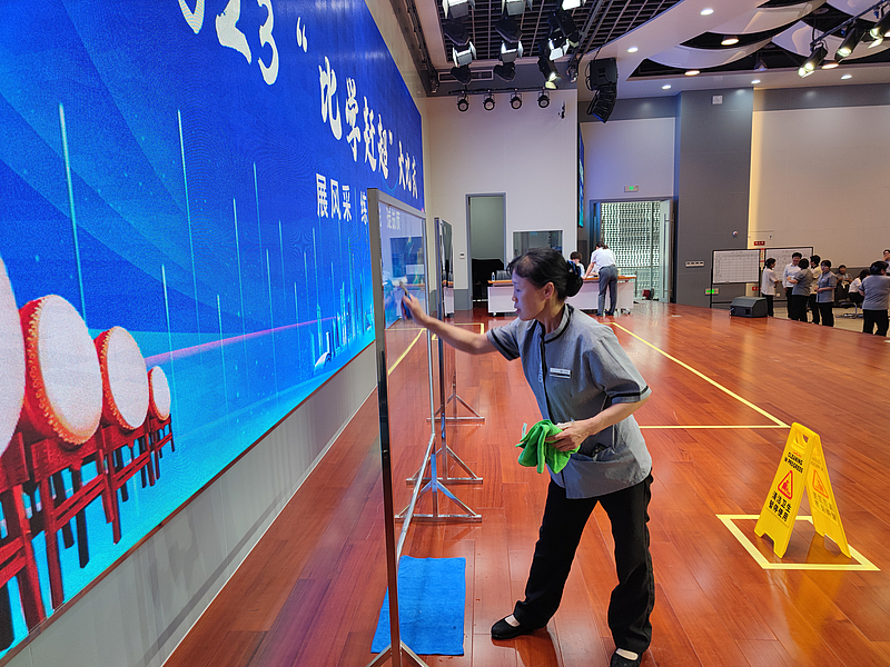 隨著比賽開始,保潔序列選手依次入場,她們嫻熟地操作著各種清潔藥劑和清潔設(shè)備,將看似平凡的工作做到極致。