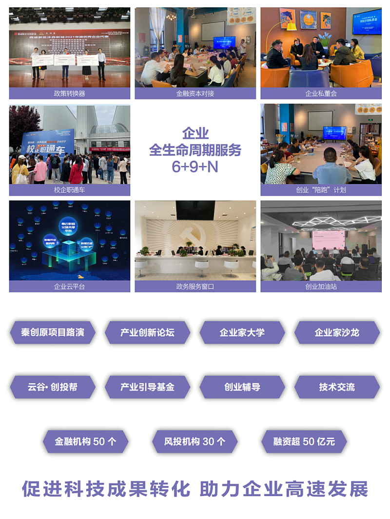 園區(qū)結(jié)合現(xiàn)有“成果轉(zhuǎn)化、創(chuàng)新基礎(chǔ)、雙創(chuàng)承載”三大創(chuàng)新平臺,圍繞“政產(chǎn)學(xué)研金投”六個維度,優(yōu)化“政策轉(zhuǎn)換器”“人才直通車”“資本對接橋”等九大產(chǎn)業(yè)生態(tài)服務(wù)內(nèi)容,全面打造西部云谷產(chǎn)業(yè)“6+9+N”成果轉(zhuǎn)化服務(wù)模式。