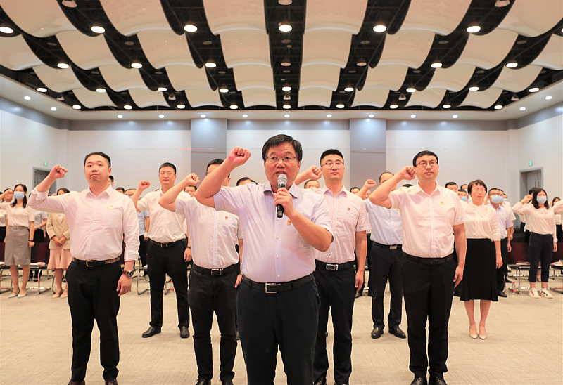 隨后,在楊建柱同志帶領下,新發展黨員面對黨旗莊嚴宣誓,其他參會黨員一起重溫入黨誓詞。