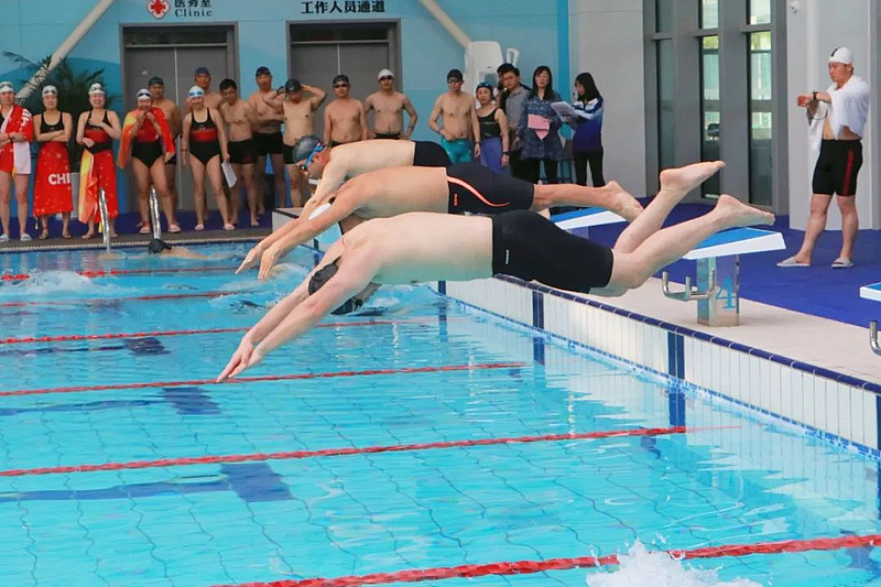 本次比賽設(shè)置男子女子50米蛙泳、自由泳,團(tuán)體200米蛙泳接力、200米自由泳接力和團(tuán)體趣味賽等7個(gè)項(xiàng)目。參賽選手們個(gè)個(gè)摩拳擦掌,舒展筋骨,做足賽前熱身運(yùn)動(dòng),欲一展水上風(fēng)采。