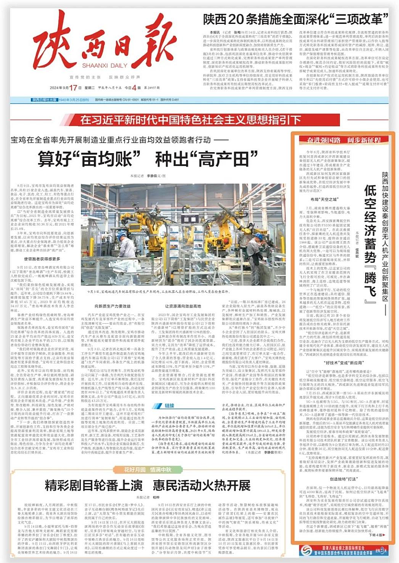 近日,陜西日報頭版刊發《陜西加快建設秦創原無人機產業創新聚集區——低空經濟蓄勢“騰飛”》,報道西咸新區作為秦創原總窗口在低空經濟發展中率先成形起勢,打造西部低空經濟發展先行示范區,為高質量發展不斷注入強勁動能。自2023年起,灃西科創搶抓低空經濟新賽道,提前布局無人機產業,在產業氛圍營造、產學研合作、產業配套服務體系搭建等方面開展了一系列工作。