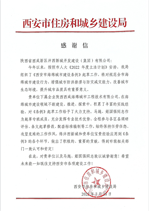 近日,灃西集團收到一封來自西安市住房和城鄉(xiāng)建設局的感謝信,信中對集團下屬企業(yè)陜西西咸海綿城市工程技術有限公司協(xié)助編制《西安市海綿城市建設條例》過程中展現(xiàn)出的專業(yè)水平與職業(yè)素養(yǎng)表示高度認可與贊揚。感謝信指出,作為《西安市海綿城市建設條例》起草專班團隊,海綿城市技術公司充分發(fā)揮實踐經(jīng)驗豐富、專業(yè)技術領先等優(yōu)勢,全程參與各區(qū)縣調研評估、條文起草...