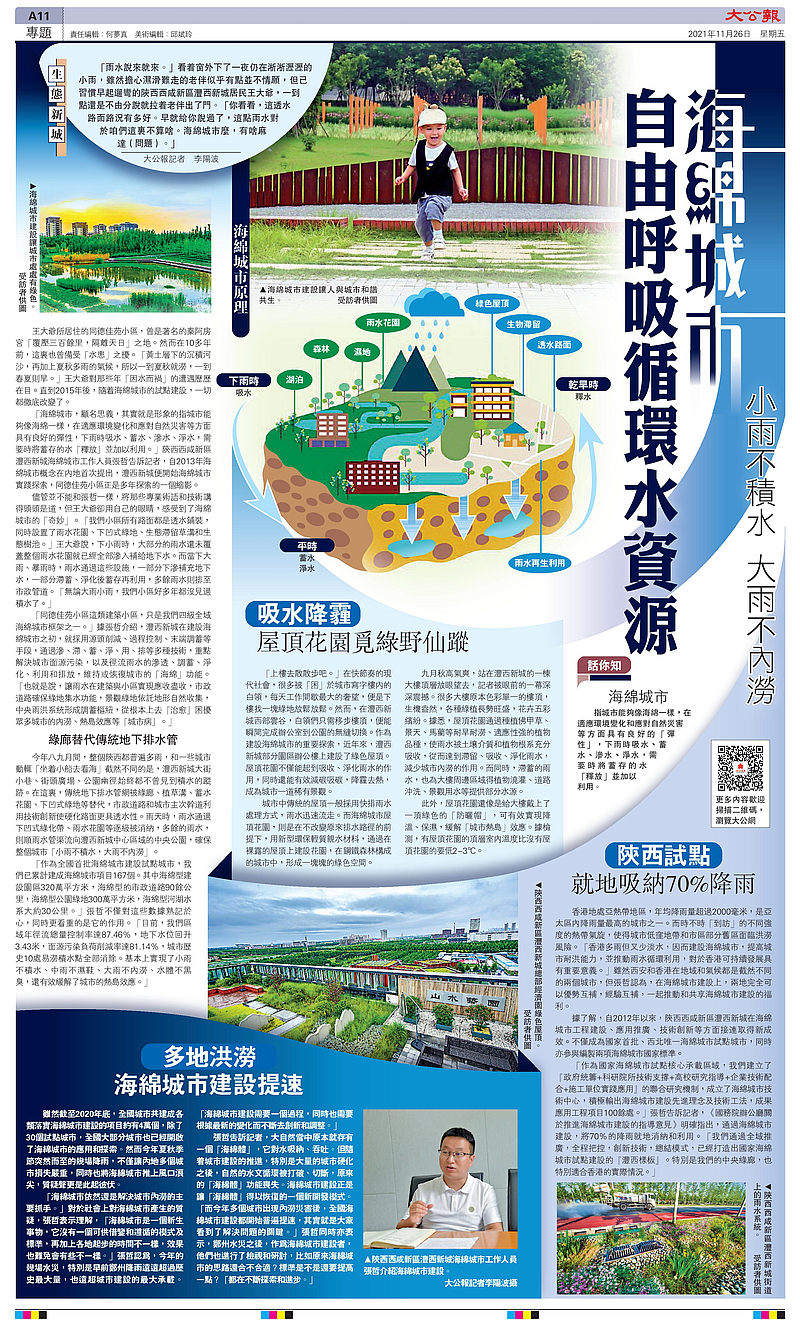“作為國家海綿城市試點核心承載區域,我們建立了‘政府統籌+科研院所技術支撐+高校研究指導+企業技術配合+施工單位實踐應用’的聯合研究機制,成立了海綿城市技術中心,積極輸出海綿城市建設先進理念及技術工法,成果應用工程項目100余處?!睆堈芨嬖V記者,《國務院辦公廳關于推進海綿城市建設的指導意見》明確指出,通過海綿城市建設,將70%的降雨就地消納和利用。“我們通過全域推廣,全程把控,創新技術,總結模式,已經打造出國家海綿城市試點建設的‘灃西樣板’。特別是我們的中心綠廊,也特別適合香港的實際情況。”