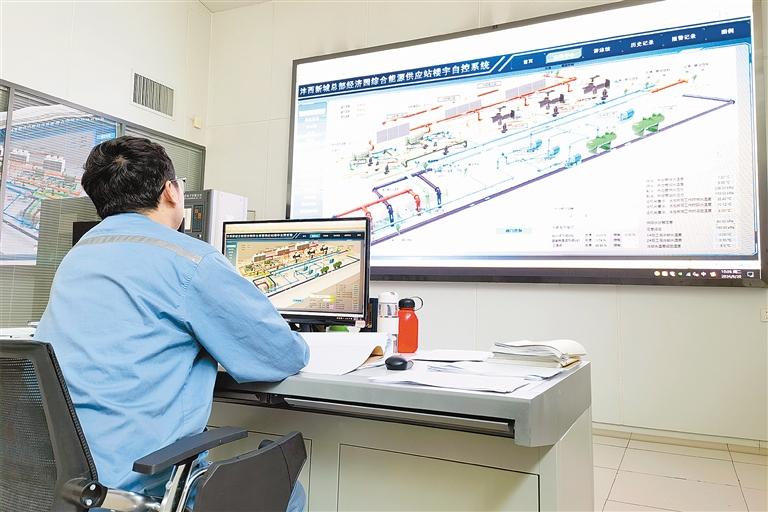 按理說,現在正是集中供冷季,應是能源供應站最繁忙的時節。看出記者的疑惑,張超興說:“能源供應站建設了智慧管控平臺,可通過電腦或手機,對站房內設備進行遠程集中控制,并通過能耗分析系統及外界環境溫度變化實時調整運行策略,保證系統安全、高效運行。”