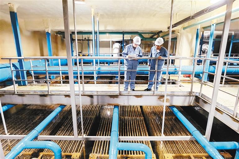 工作人員對蓄冰槽內的設備管道進行巡檢。