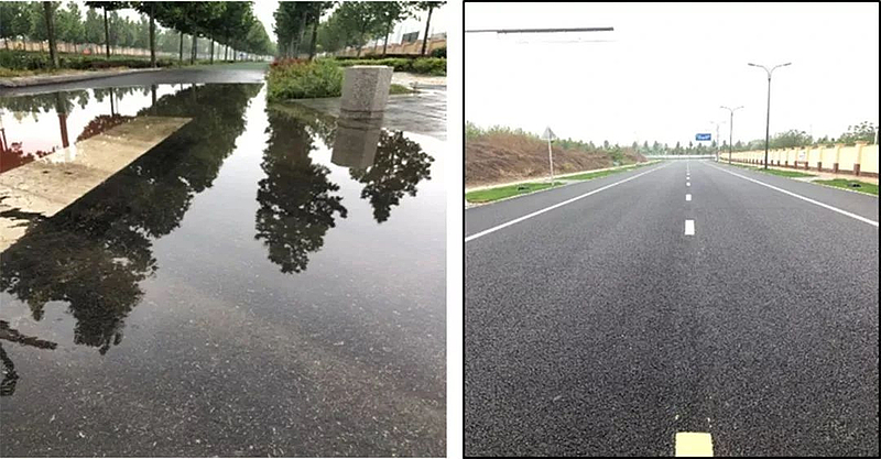 目前,研究成果已成功應用于國內首條機動車道柔性結構全透水瀝青路面——灃西新城數據六路,路面結構層均采用多孔材料,雨水通過路面材料的連通孔隙從面層入滲并部分滲入路基,從而最大限度緩解城市洪澇災害并補充地下水資源。